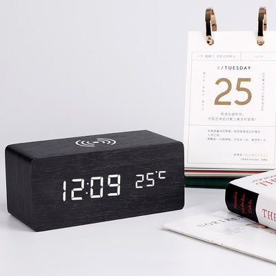 Newest Hot Selling Wooden QI Wireless Charger charging LED Calendar Time Temperature Voice Control wood Digital Alarm Clock